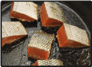 Put a bit of Olive Oil into a Cast Iron Skillet, or other frying pan that can go into the oven. Heat up the oil, to just under the smoking point. Place the Fish in the pan, spiced side down first. Let this cook for about 2-4 minutes. The rub should start to darken and you can see the Fish starting to cook up the sides. Flip the Fish over onto the skin side and cook for about 2 more minutes. Once the skin starts to get a bit crispy, place the whole pan in the oven for about 7 minutes. Do not over-cook. The Salmon should just be cooked through, with just a little bit of pink left in the middle. If it over-cooks, it will start to dry out.