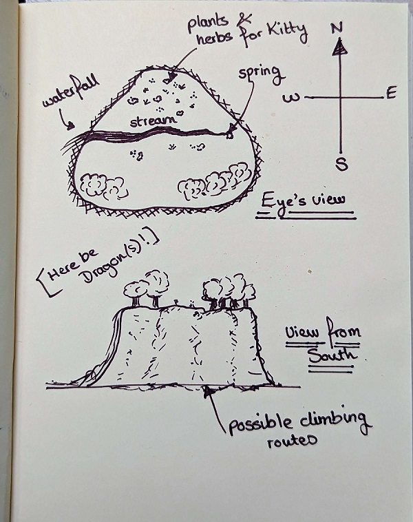 As Kitty says, the crag itself is actually quite good for cover, apologies, my map-making skills are not my forte and I wasn't making this map with the plan to share is as a battle strategy! There is certainly more bushes and trees than I showed, assuming we get up there okay then whether the dragon is there or not we should be able to remain hidden.